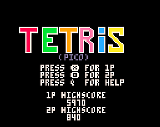 PicoTetris by Ruben Drai is his personal interpretation of the welll known game Tetris for PICO-8. There is a singleplayer mode as well as a two-player mode in the game.